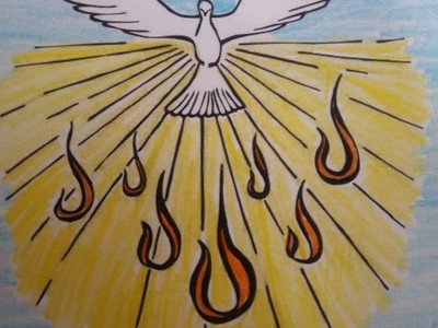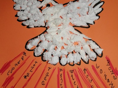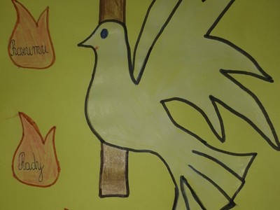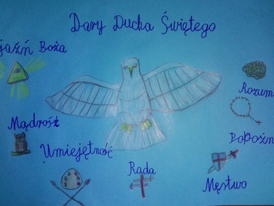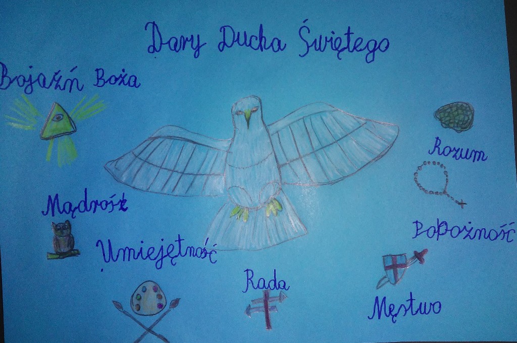 Przygotowując się do Uroczystości Zesłania Ducha Świętego dzieci klas pierwszych poznały różne jego symbole. Najczęściej używany jest symbol gołębicy – w Księdze Rodzaju pojawia się jako znak łagodności, pokoju i pojednania Boga z ziemią (historia Noego). Gdy Chrystus wychodzi z wody po swoim chrzcie, zstępuje na Niego Duch Święty w postaci gołębicy.