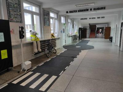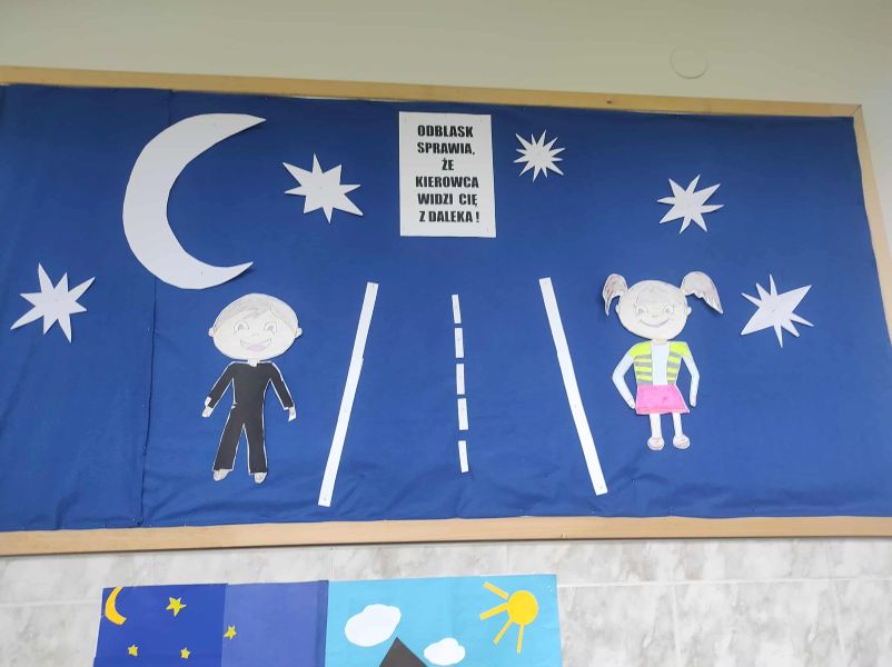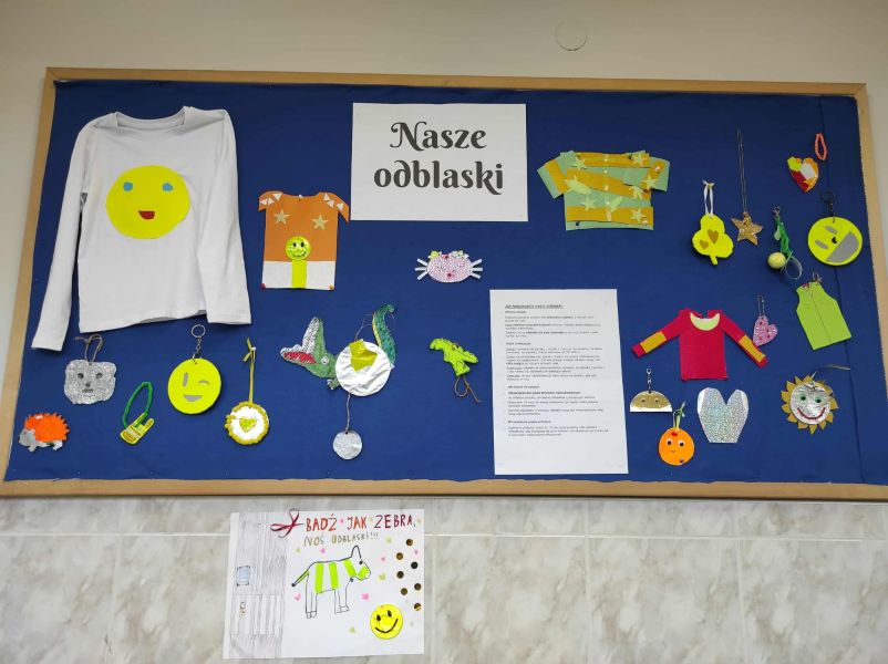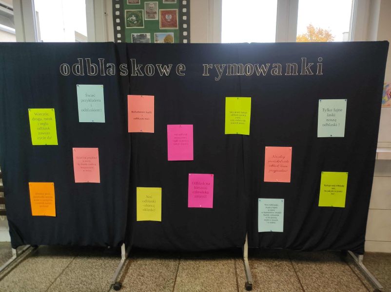 W naszej szkole od miesiąca trwa akcja odblaskowa. Na korytarzach są rozwieszone plakaty, gazetki, maskotki odblaskowe, miasteczko ruchu drogowego, znaki drogowe. Stworzone rymowanki odblaskowe przez członków klubu Bimed również znalazły miejsce na korytarzach.
