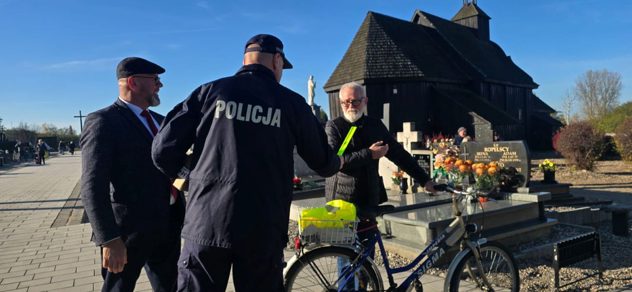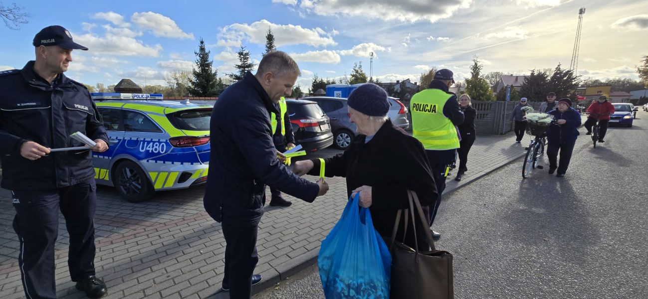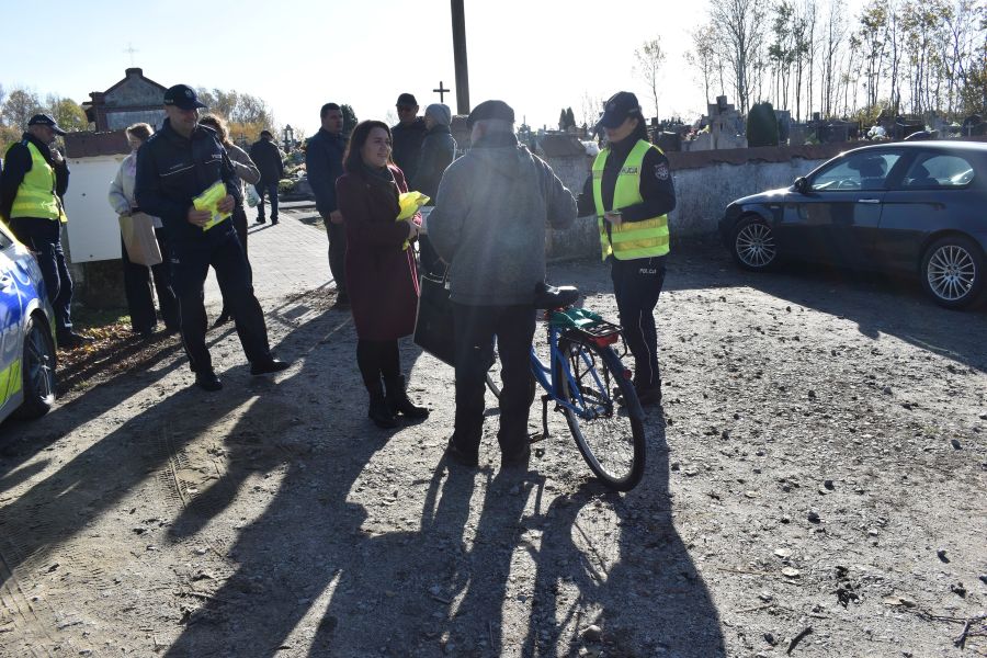 Policjanci z Komisariatu Policji w Kłodawie wspólnie z dziećmi z Szkoły Podstawowej nr 2 w Kłodawie oraz przedstawicielami lokalnych samorządów i firm rozdawali odblaski oraz kamizelki przed cmentarzami na terenie gminy Kłodawa, gminy Przedecz i gminy Chodów.