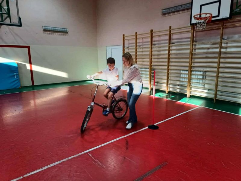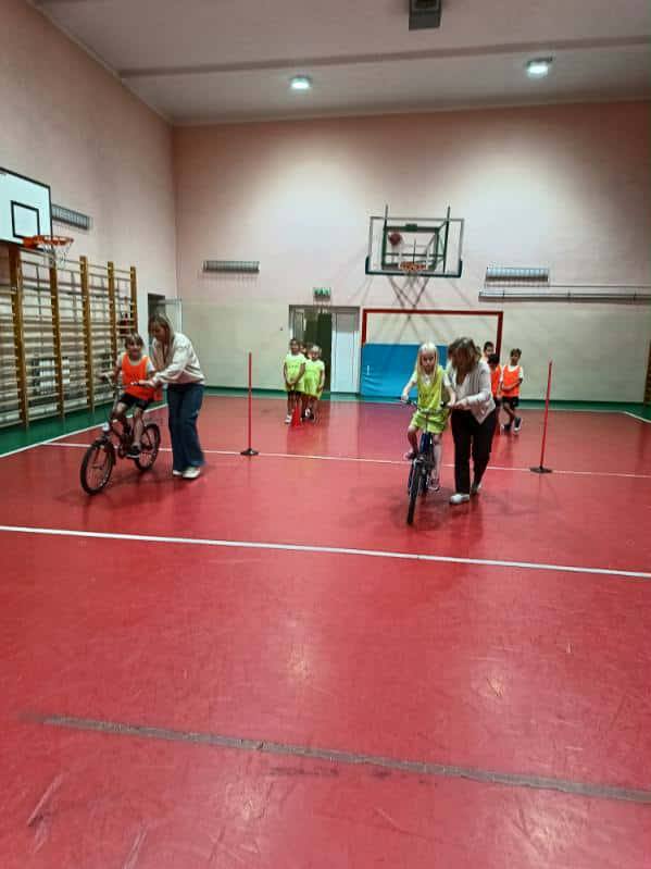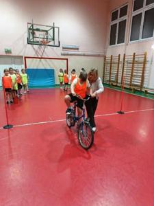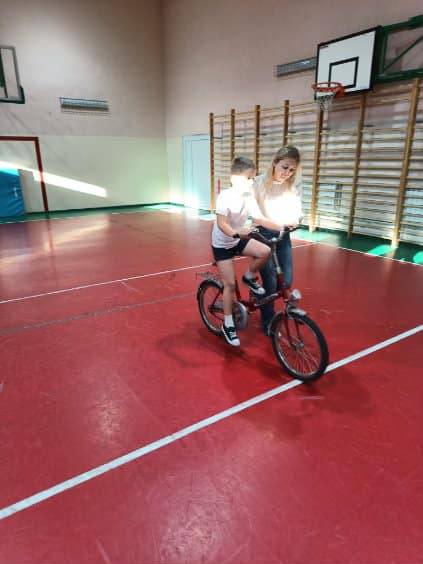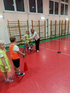 Najmłodsi uczniowie naszej szkoły uczą się jak jeździć na rowerze pod okiem wychowawczyń i pani Agnieszki Bałdygi. Początki są trudne ale będzie coraz lepiej.