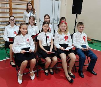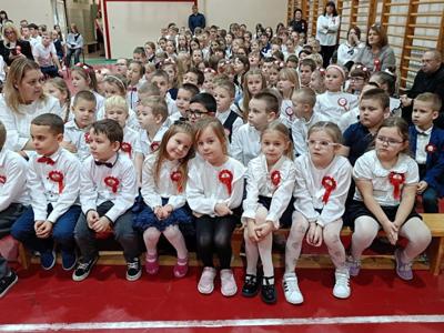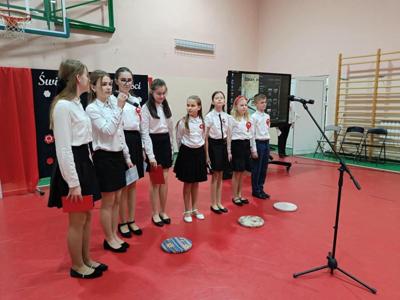 Uroczystą akademię przygotowały klasy IV i VII pod opieką wychowawczyń. Punktualnie o godzinie 11:11 rozbrzmiały dźwięki „Mazurka Dąbrowskiego”, który odśpiewali wszyscy obecni na uroczystości, ubrani odświętnie, z biało - czerwonymi kotylionami przypiętymi do serca. Uczniowie klas 0 -III wzięli udział w konkursie "Szkoła do hymnu". Nagranie zostało już wcześniej przesłane do organizatorów konkursu.