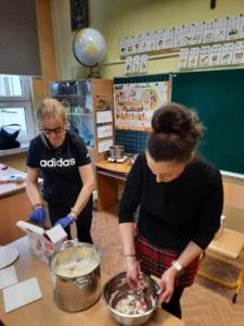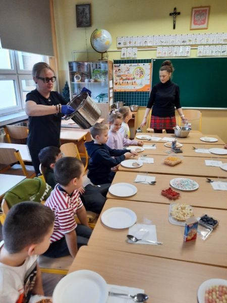 Uczniowie klasy 1 b wzięli udział w warsztatach cukierniczych. Z inicjatywą wyszła mama jednej z uczennic, która wraz z drugą panią poprowadziła te zajęcia. Dzieci wykonały pyszne deserki, którymi poczęstowały panie dyrektor, panie kucharki i panią pielęgniarkę. Była to też dobra okazja, żeby przypomnieć sobie jak należy przygotowywać potrawy, zachowywać się przy stole i dbać o porządek. Na zakończenie "słodkich " zajęć była degustacja i pamiątkowe zdjęcia.